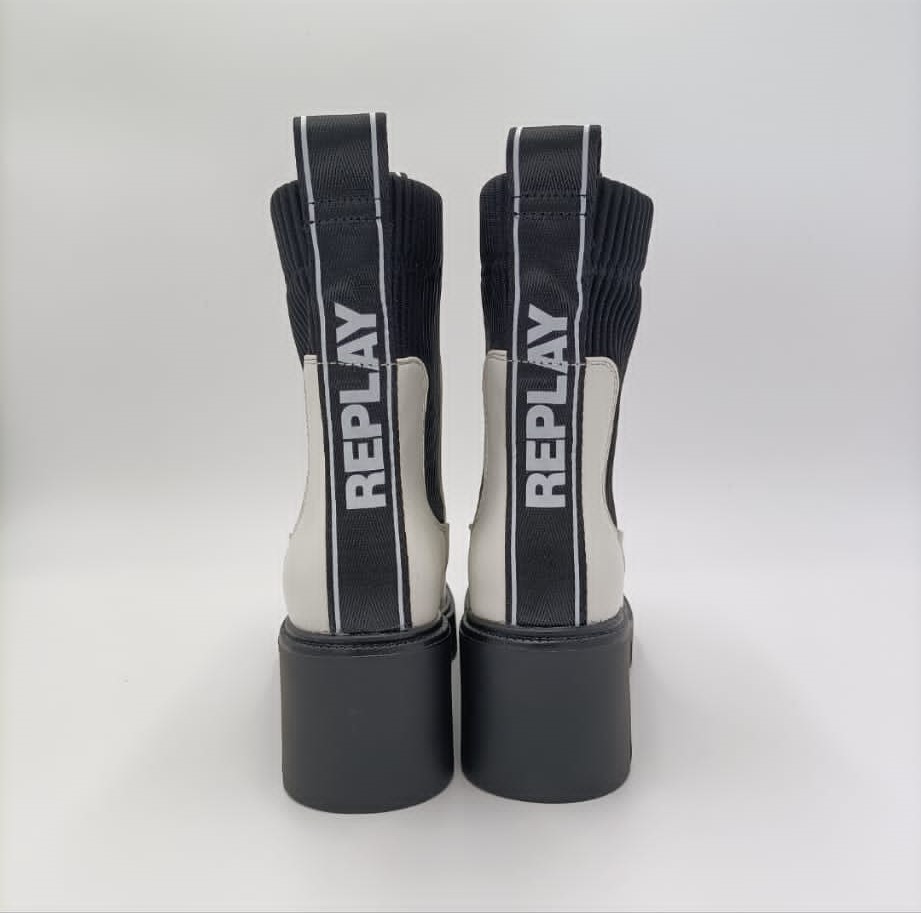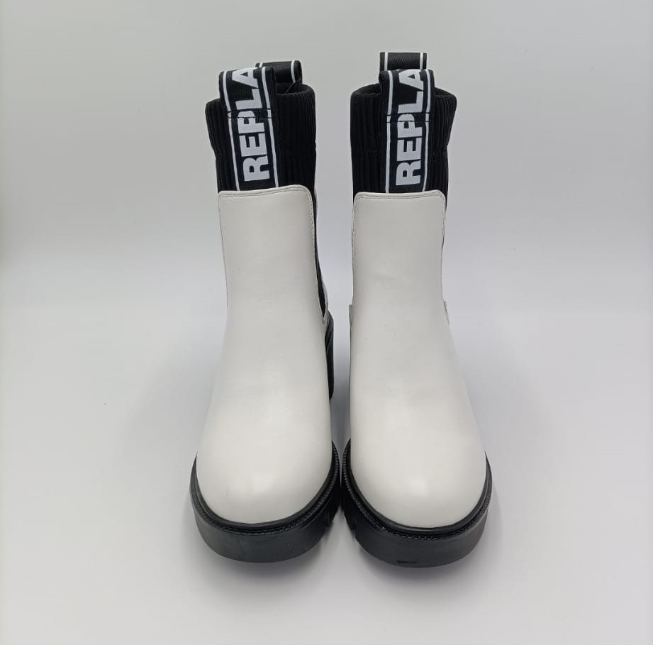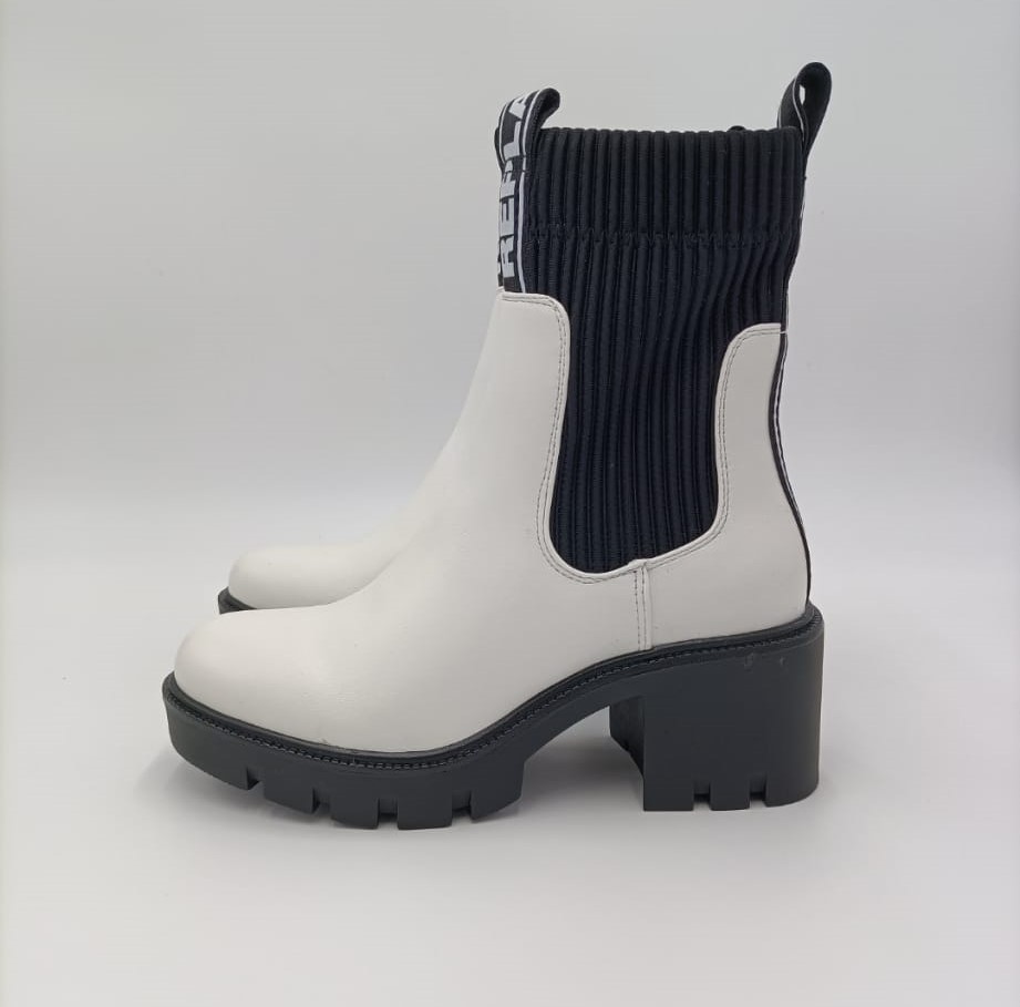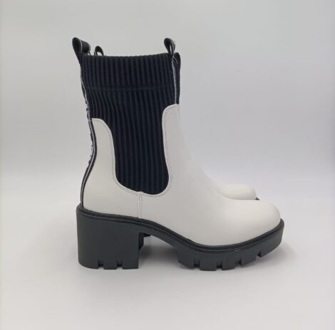 Botas de mulher VILLAGE CHELSEA em pele chelasea com sola de orelhas, parte superior lisa em branco, parte superior do cano em tecido preto elástico e presilha têxtil com logótipo nas costas.