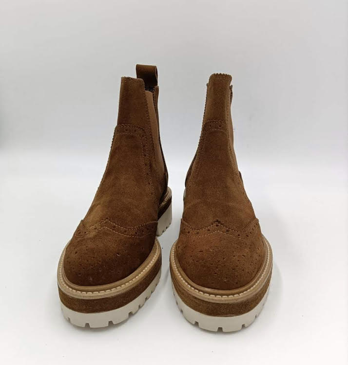Botins com interior em pele e no exterior camurça castanho. Plataforma de 5 cm. Com detalhe com corda a toda a volta na parte da plataforma. Na lateral elástico para facilitar a entrada do botim.