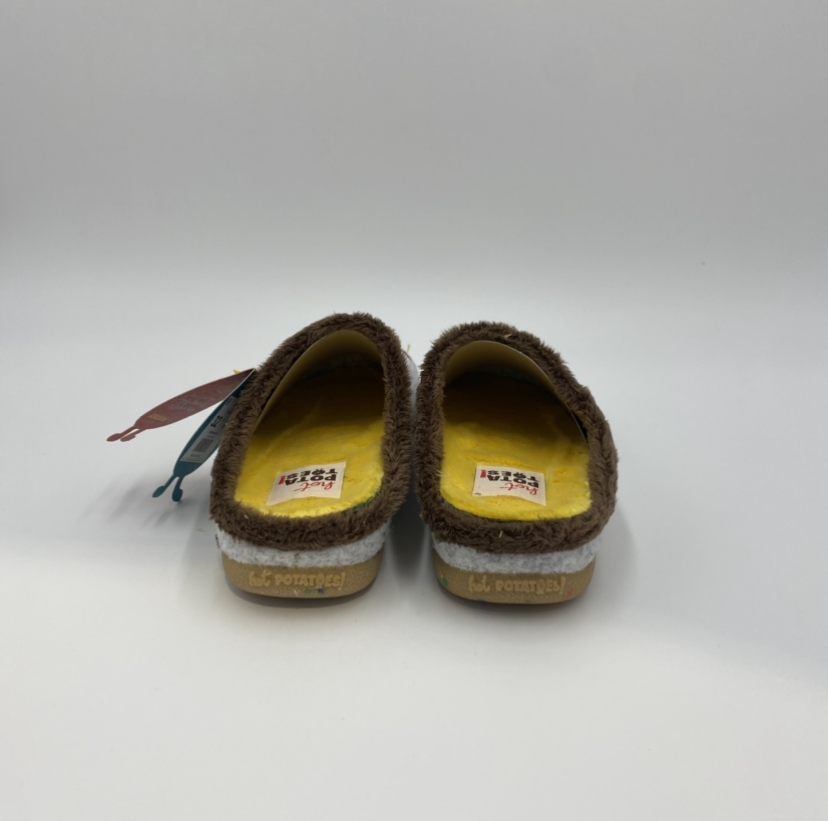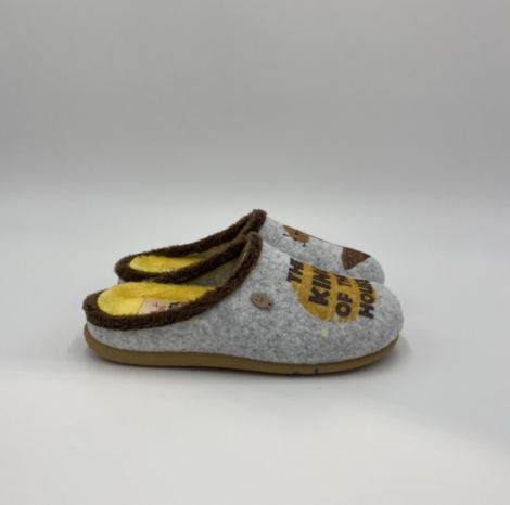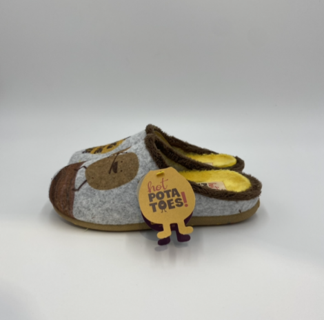 Os mais pequenos lá de casa também são fãs da Hot Potatoes. Descobre a coleção infantil outono-inverno! Chinelo de quarto tipo babucha, corte estampado tipo malha com frase “The king of the house”, debruado e palmilha de tecido turco suave e transpirável. Forro de poliéster transpirável. A palmilha é removível de material 100% reciclado e a sola de borracha natural. As “batatinhas” mais confortáveis, divertidas e sustentáveis estão na Hot Potatoes.