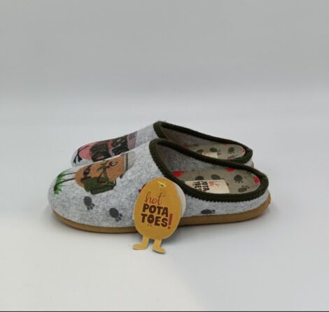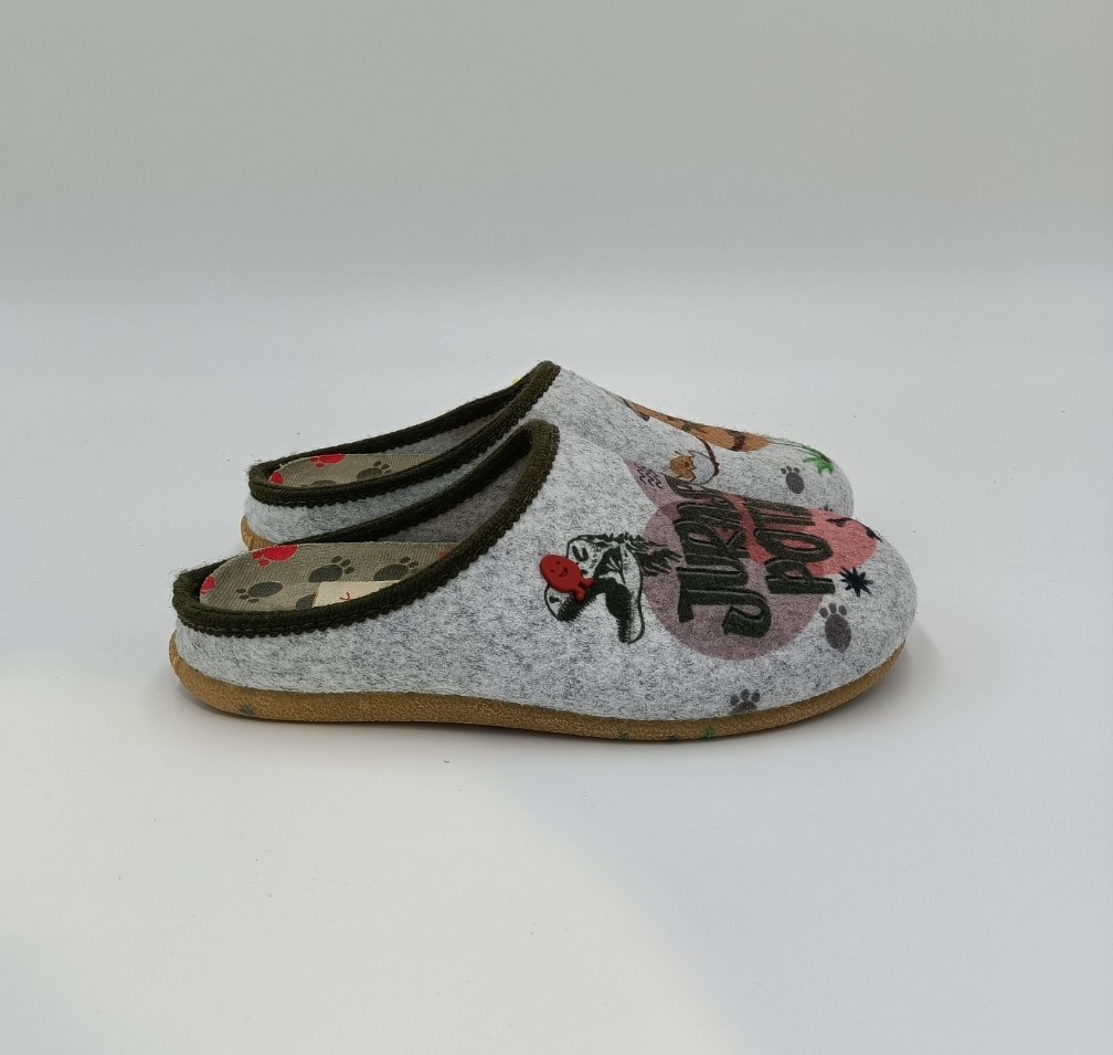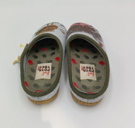 Cómodos, bonitos e quentinhos, não precisas nada mais. Chinelos de quarto tipo babucha cor cinzento ao estilo “Jurassic potato”. O corte é de feltro PET reciclado. O apoio da palmilha é com estampado de patas sobre Suapel e o ribete de pelo muito suave. A palmilha é extraível e de espuma de poliuretano 100% reciclado. A sola é de borracha natural em tom caramelo com ribetes coloridos de borracha EVA.