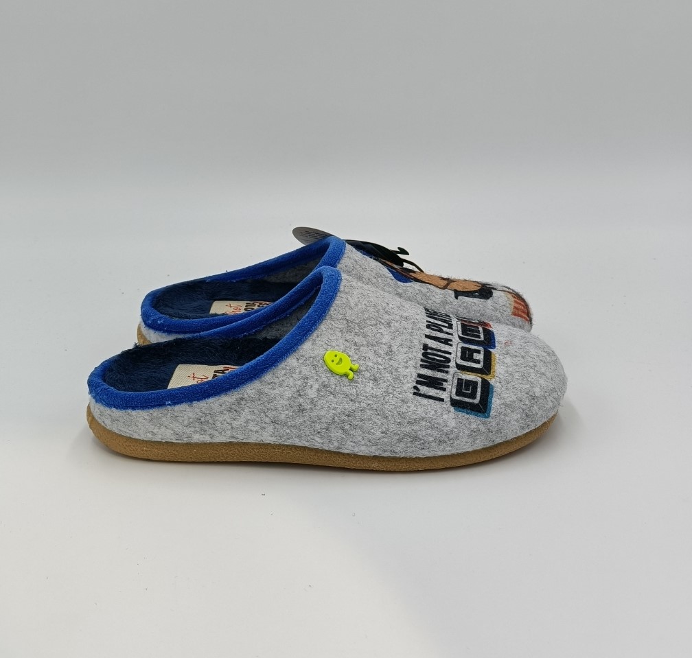 Cómodos, bonitos e quentinhos, não precisas nada mais. Chinelos de quarto tipo babucha cor cinzento ao estilo “I’m not a player i’m a gamer”. O corte é de feltro PET reciclado. O apoio da palmilha sobre Suapel e o ribete de pelo muito suave. A palmilha é extraível e de espuma de poliuretano 100% reciclado. A sola é de borracha natural em tom caramelo com ribetes coloridos de borracha EVA.