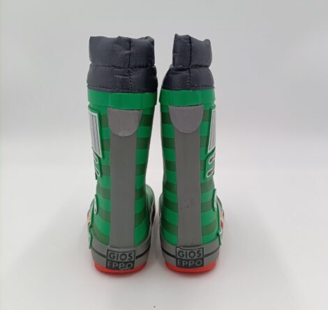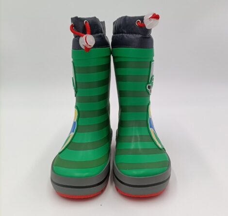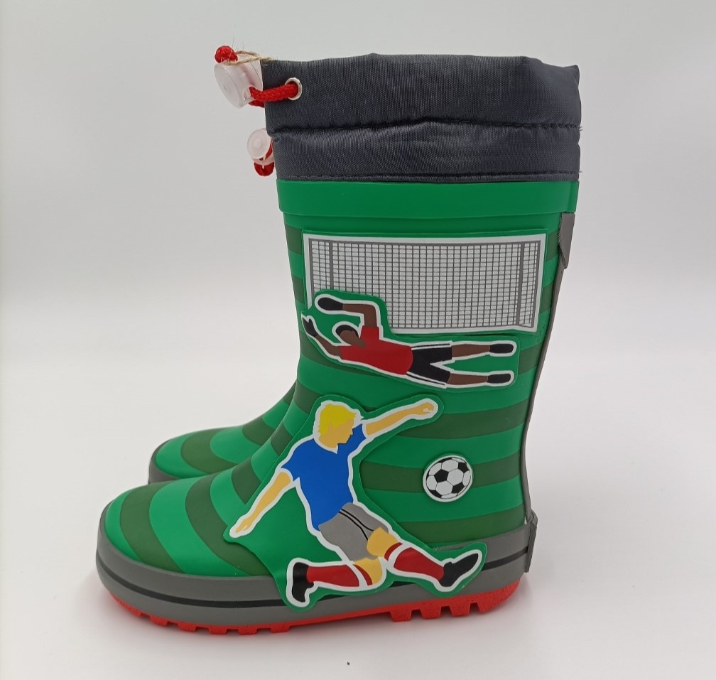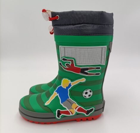 Prontos para os dias chuvosos! Botas estilo galocha de borracha natural verde com estampado de um campo de futebol. Fecho ajustável. Têm forro de algodão e palmilha acolchoada para maior conforto. Detalhe retrorrefletor no calcanhar.