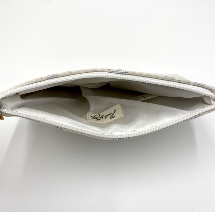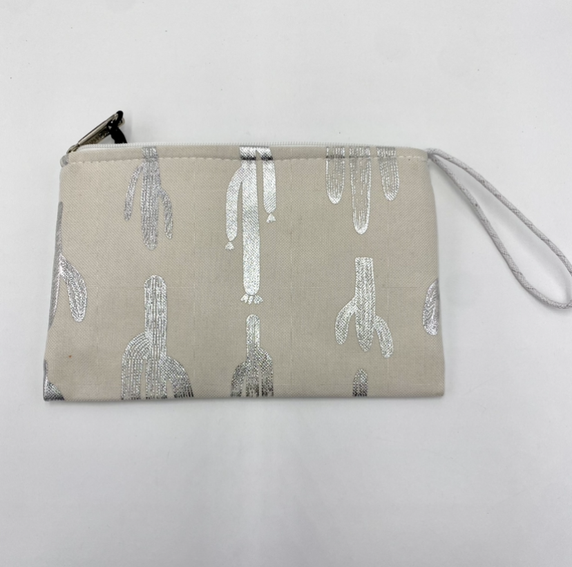Uma bolsa em branco com cactos em prateado. As suas pequenas dimensões são ideais para transportar confortavelmente o que necessita nos seus passeios de verão. Irradie vitalidade e estilo com esta bolsa em tons neutros.