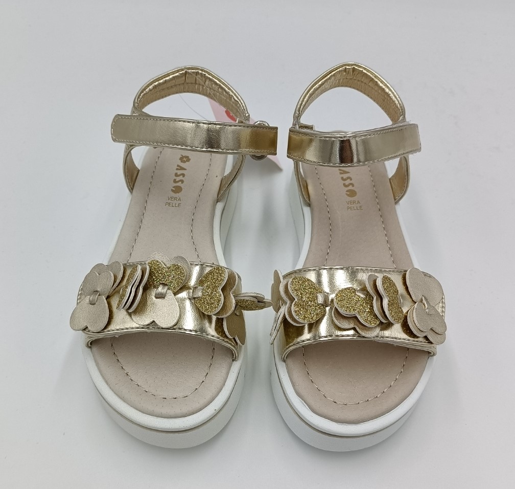 Sandália menina Asso da coleção primavera/verão. Parte superior em pele sintética com inserções de purpurina e borboletas. Palmilha de couro. Fecho de gancho e laço. Sola de borracha bicolor, altura 2,5 cm.