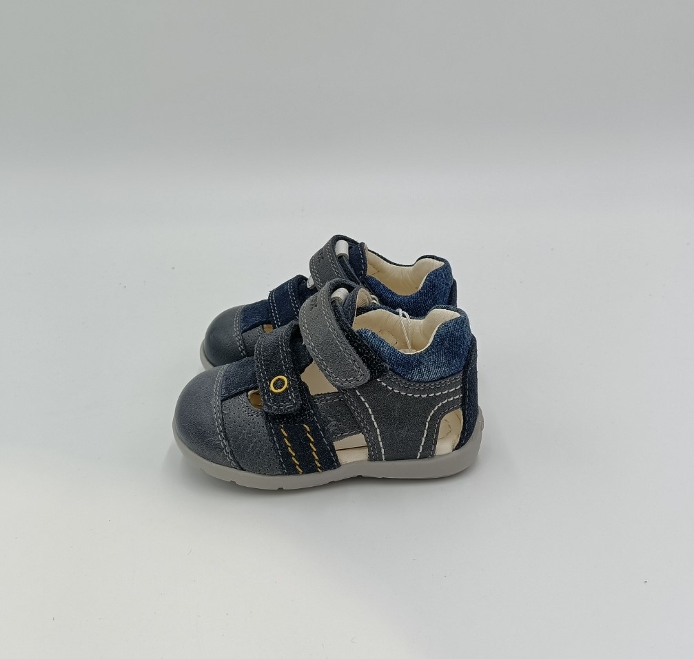 Sandália masculina casual com design respirável e confortável. Confeccionada em couro camurça e napa na cor azul marinho com detalhes em amarelo contrastante, a sandália Kaytan tem costas fechadas e vai mimar os pés das crianças durante todo o verão.