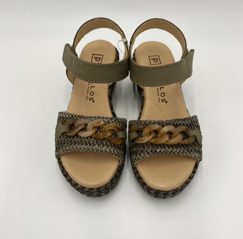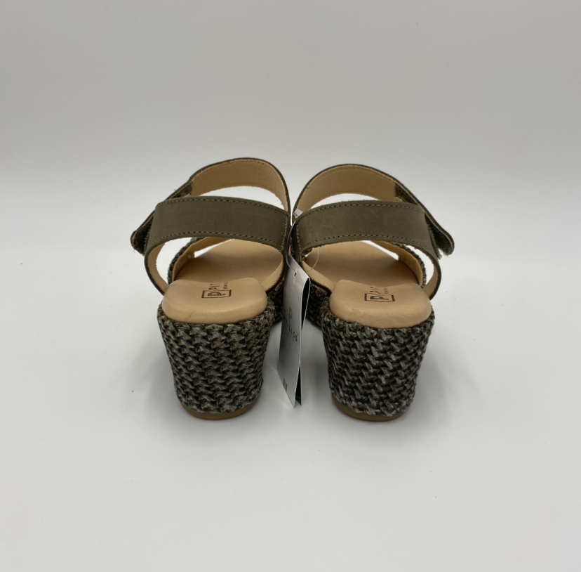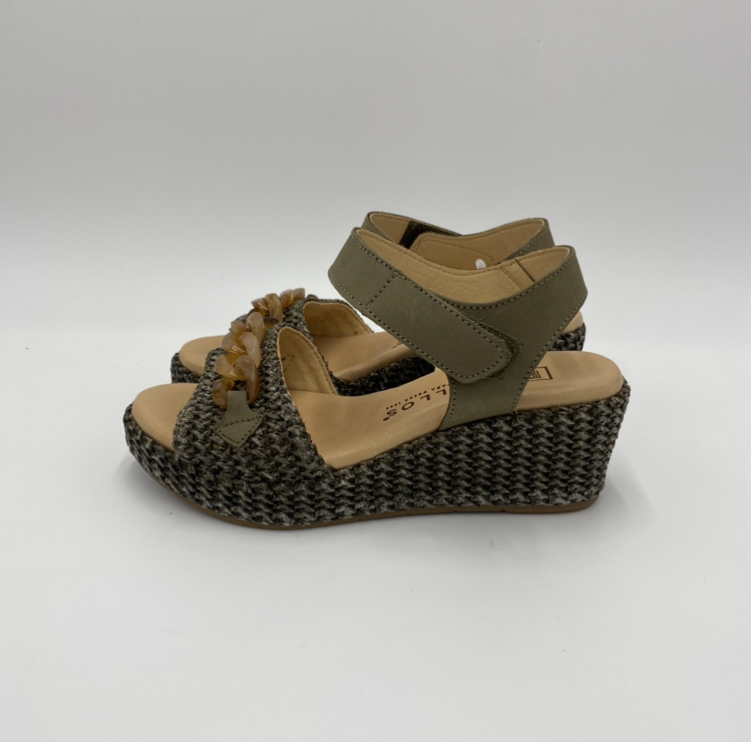 Sandália de cunha em pele e rafia em tons de verde tropa. Sua aparência casual e jovem garantem que qualquer estilo é perfeito para 24 horas por dia. Tem fecho de velcro. A cunha mede 5,5 cm.