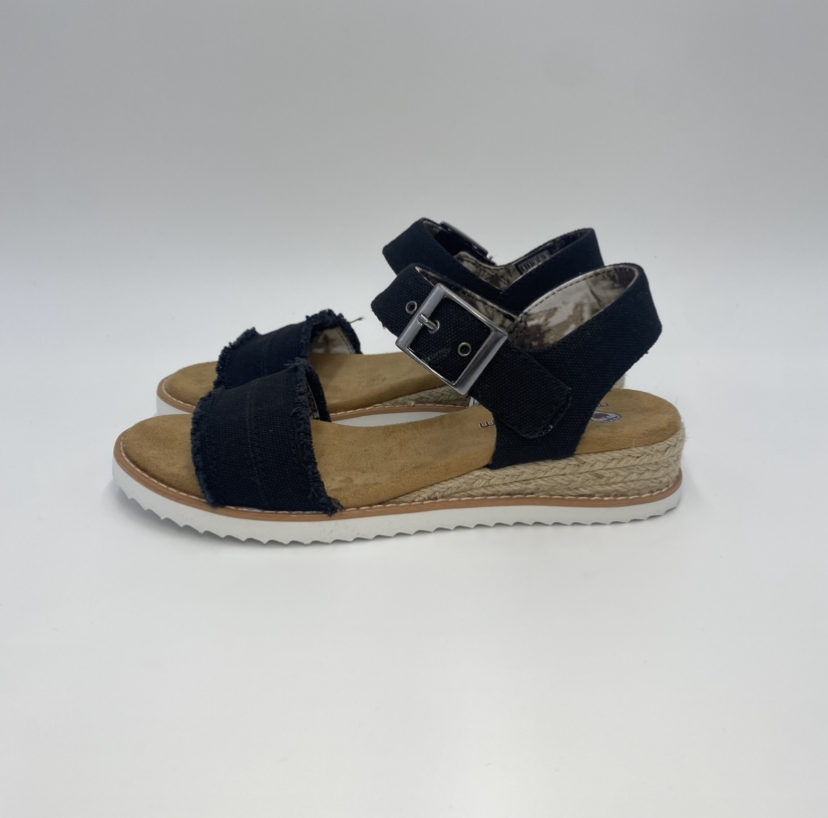 Anda ao sol com estilo com as sandálias BOBS from Skechers™ Desert Kiss – Adobe Princess. Estas sandálias com tiras em velcro confortáveis têm a parte superior em lona com detalhes desfiados e uma palmilha viscoelástica almofadada.
