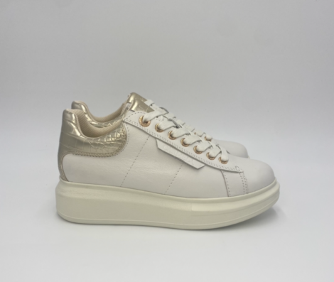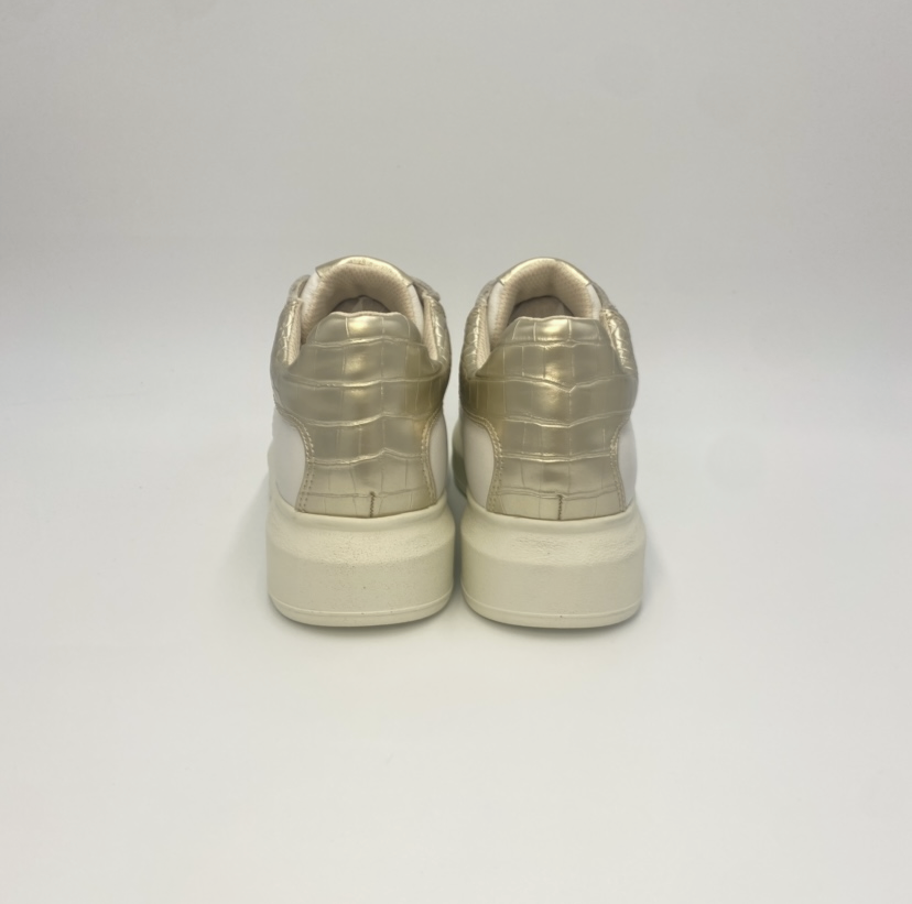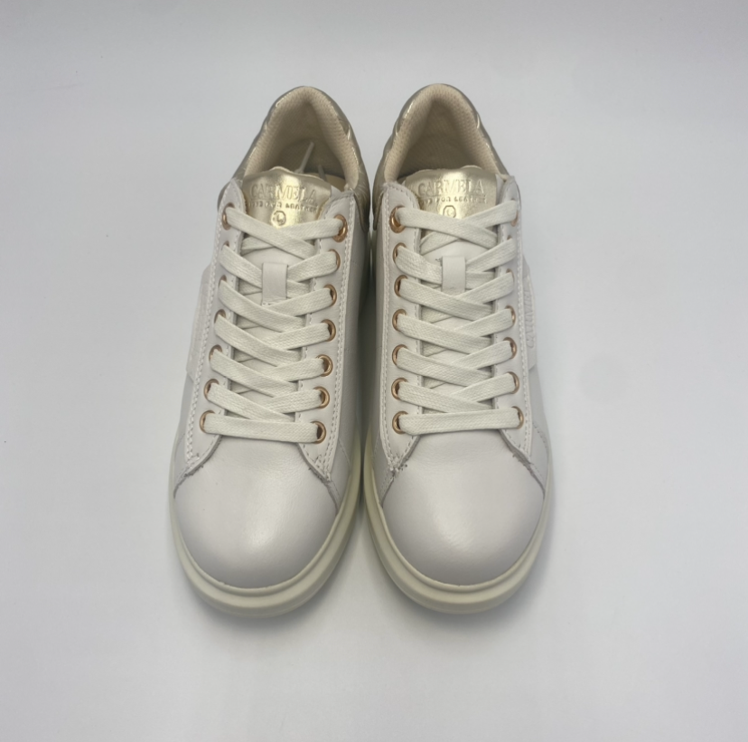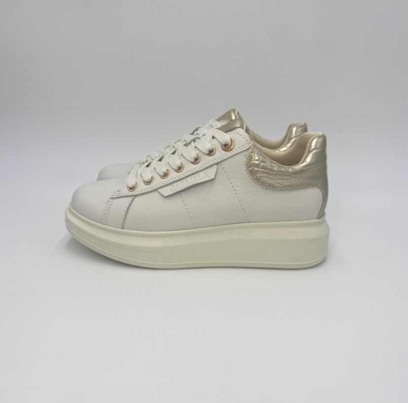 Tênis feminino, marca Carmela. Fabricado em couro de alta qualidade. Com detalhes metálicos nas costas, efeito crocodilo. Combinação simples mas elegante de cor e couro. Sola de borracha antiderrapante.