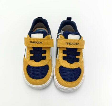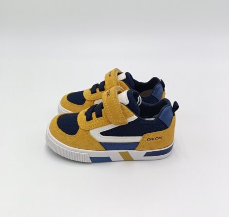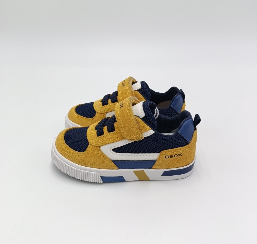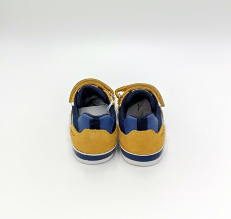 Tênis casual respirável de corte baixo para meninos com solado vulcanizado. Renderizado em amarelo ocre e azul marinho, Kilwi apresenta um design original com tons vintage. Ela foi confeccionada em mesh e camurça e oferece todo o conforto, flexibilidade e suporte que as crianças precisam durante o dia.
