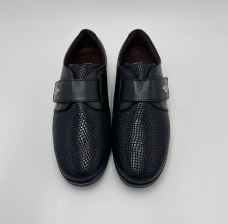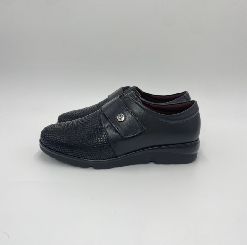 Sapato abotoado em nappa e couro patenteado, com velcro que proporciona um ajuste simples e prático, que se encaixa em qualquer pé. Sua cunha baixa lhe dá uma vantagem de personalidade.