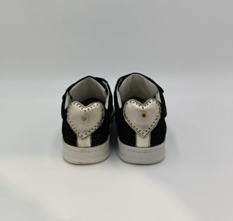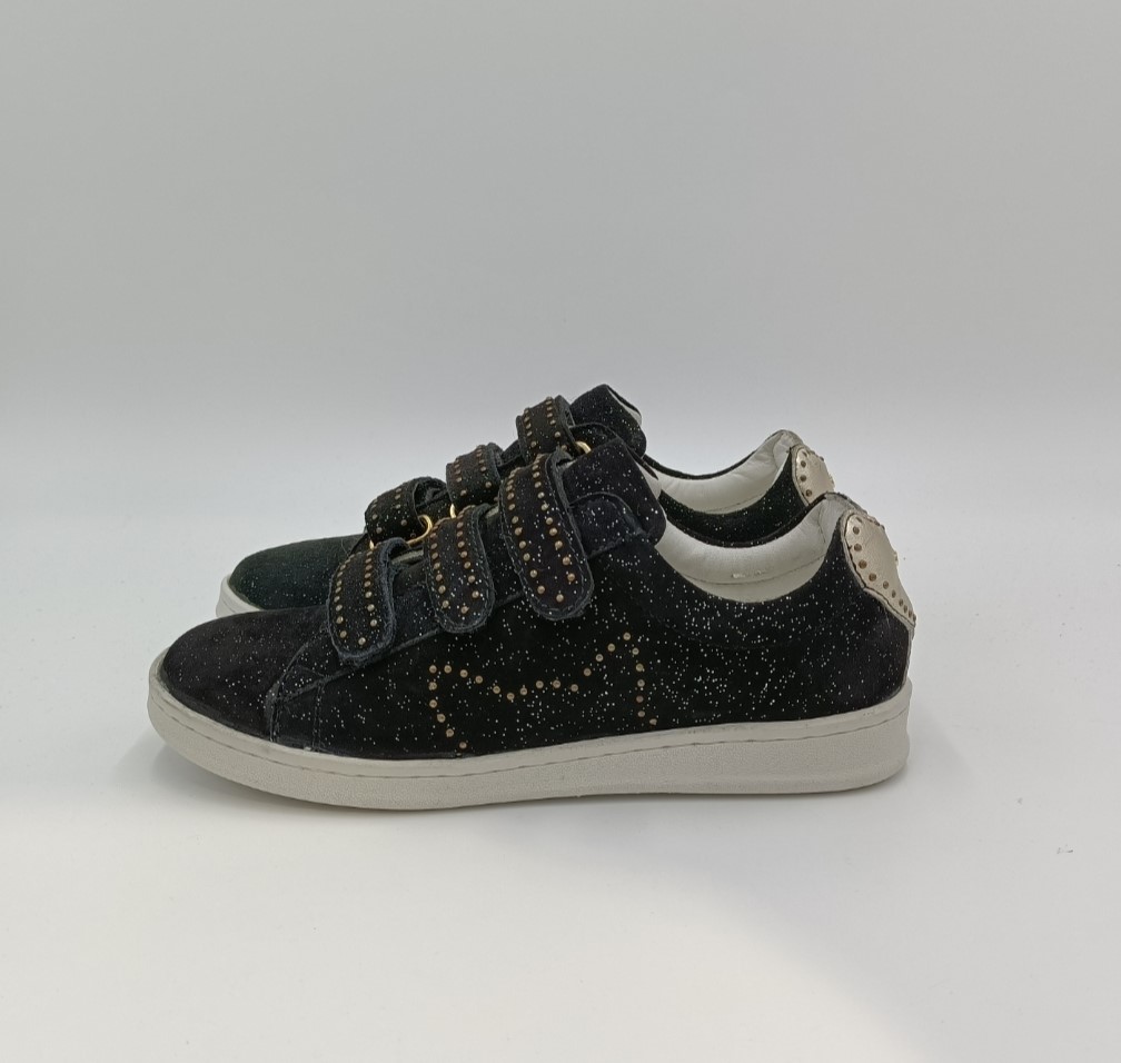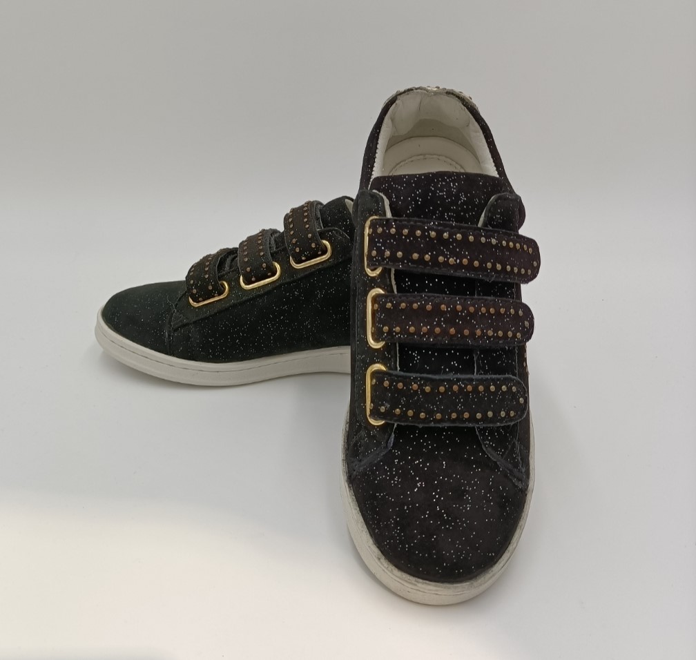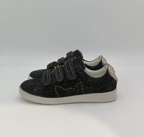 Tênis em camurça preta brilhante. Adornado com a cabeça de um gato em pequenas unhas douradas nas laterais. Fechamento 3 arranhões aprovados com unhas douradas na parte superior do pé. Coração dourado na parte de trás do sapato. Couro totalmente forrado. Sola de 2,5 cm de espessura.